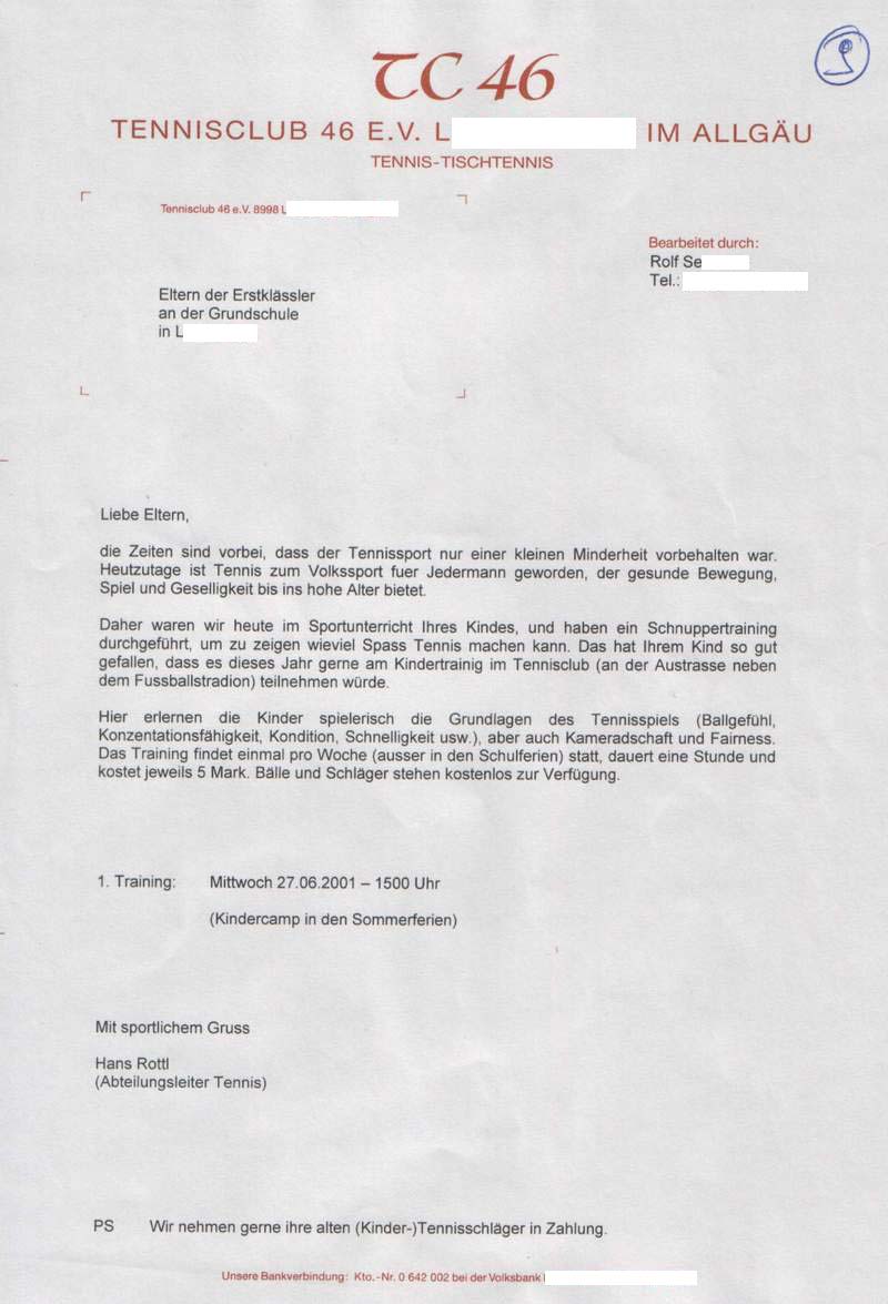 Liebe Frau S., hier kommt noch das Schreiben vom Tennisclub an die Eltern und der Briefwechsel vom Winter, wo es zum Thema Skifahren schonmal dasselbe Problem gab. Auch hier sind ca. 10 Kinder aus Marios Klasse gewesen, die sich fürs Skitraining angemeldet haben und auch hier wusste ich nicht wie ich dem weinenden Kind diese Gemeinheiten erklären sollte. Ich kann es nicht glauben, dass sie schon wieder ihre eigenen Interessen ohne jede Rücksicht auf die Gefühle und Wünsche des Kindes durchsetzt, nur um mir zu schaden bzw. weil Sie es als persönliche Niederlage empfinden wuerde, wenn der Mario mich öfter sehen wuerde als alle 14 Tage.
