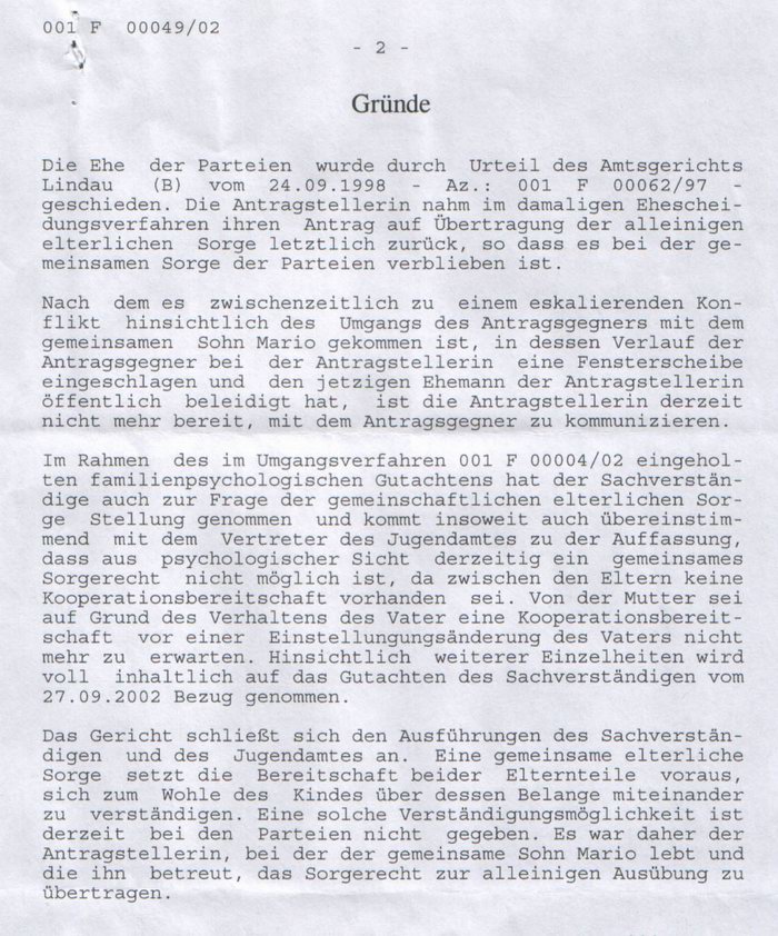 24.09.1998 - Scheidung und erster Versuch das Kind dem Vater zu entziehen (Sorgerecht & Umgangsrecht). Das Gericht entscheidet auf gemeinsames Sorgerecht. Man einigt sich in Absprache mit dem Jugendamt auf ein Umgangsrecht von 10 Tagen im Monat. 10.08.2000 - Zweiter Versuch dem Kind den Vater zu entziehen. Das Gericht lehnt abermals beide Anträge ab und entscheidet auf 14 tägiges Umgangsrecht am Wochenende. Marios unaufgeforderte und unbemerkt notierte Äusserungen: Wochenende 01: "Papa, der Martin schimpft immer