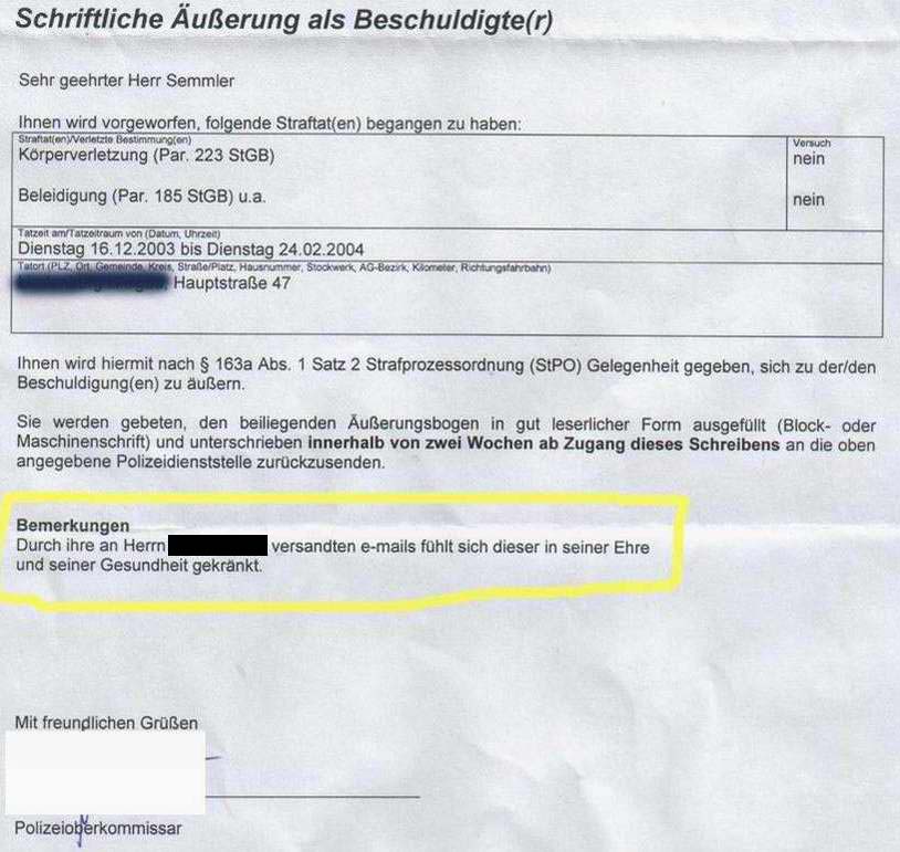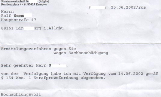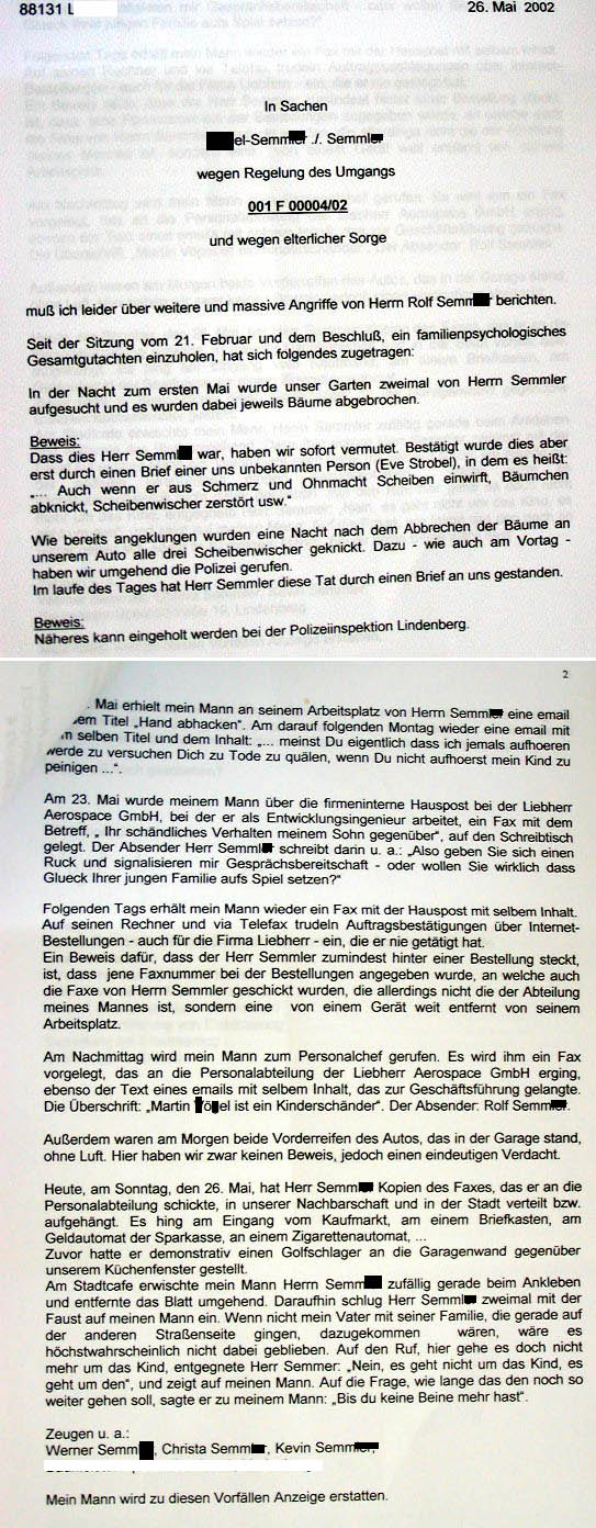 L. Ha Ha Ha Ha Ha Ha Ha 30.07.2002 Nach sieben Monaten und zwei Wochen straflosem Umgangsentzug, permanenter Vergewaltigung des Kindes und Gehirnwäsche, kommt es zu einem Treffen zwischen Kind und Kindsvater, Jugendamt (Herrn Pfröpfle) und dem Gutachter. Das völlig verschüchtert wirkende Kind blockt jedes Gespräch ab und versucht sich mit Aussagen wie "weiss nicht" "es soll alles bleiben wie es ist" oder "wegen der Scheibe" aus der Affaire zu ziehen (auf Fragen, ob es sich über ein Geburtstagsgeschenk vom Vater freuen würde, ob es nicht besser wäre kurz zu grüssen, als wegzurennen wenn man sich zufällig auf der Strasse trifft, oder warum es denn überhaupt wegläuft). Kein Wunder, wo die Kindsmutter auch hier wieder deutlich hörbar hinter der Tür steht und das Gespräch belauscht. Die einzige klare Aussage kommt auf die Frage, ob es denn auch nicht mehr zu seiner heiss und innig geliebten Oma fahren möchte: Ja, doch. Aber auch dieser Kindswunsch wird von den Stiefeltern zwei Wochen später konsequent zunichte gemacht (weil er ja da sowieso wieder (?) bearbeitet (??) würde). 04.11.2002 - Im Anschluss an eine weitere Anzeige von Martin Dödel sieht die Staatsanwaltschaft K. neuerlich von einer Verfolgung wegen Verleumdung ab und stellt das Verfahren ein. 27.11.2002 - Der Vater wird vom Amtsgericht L. zu einer Freiheitsstrafe von 5 Monaten und 60 Tagessätzen zu je 10 EUR verurteilt, wegen Beleidigung (Schreiben "Martin Dödel ist ein Kinderschänder" an den Arbeitgeber)und angeblicher Körperverletzung. Die Hauptverhandlung über die Berufung ist für den 12.03.2003 angesetzt. 02.01.2003 - Nach über einem Jahr darf das Kind an drei Nachmittagen seine Grosseltern sehen, die zu diesem Zweck aus Köln angereist sind. Die Treffen verlaufen sehr lebendig und glücklich. Am 30.01.2003 wird die für mehr als ein Jahr (zur Erstellung des Gutachtens) unterbrochene Verhandlung fortgesetzt. Auf Anraten des anwesenden Gutachters und des Jugendamtsvertreters soll das Umgangsrecht für ein Jahr ausgesetzt werden, damit das Kind mit Hilfe eines "neutralen" Therapeuten in die Lage kommt, wieder ein entspanntes Verhältnis zum Vater aufzubauen. Am 14.02.2003 wird dem Vater auf Anraten des Gutachters und Jugendamtsvertreters das Sorgerecht für seinen ältesten Sohn entzogen und die Prozesskostenhilfe verwehrt. Begründung Die Berufungsverhandlungen finden im Frühjahr vor dem Oberlandesgericht München in Augsburg statt. Am 16. April in Augsburg beim Oberlandesgericht geht es wie immer seit 1998 um den Versuch der Mutter dem Vater das Sorge- und Besuchsrecht für den Sohn zu entziehen. Sie ist wieder absolut unkooperativ und auf keinen Fall bereit von ihrer Position abzurücken. Sie lässt keine Gelegenheit aus den Vater mit Gülle zu überschütten und ist wie immer darum bemüht, ihn mit Übertreibungen, Zeit verschieben, Lügen erfinden, in den Dreck zu ziehen. Das Kind wird auch befragt und sagt dem Richter unter vier Augen, dass er nicht mehr zum "Rolf" wolle, weil er so böse Briefe schreibt, hätte die Mama gesagt. Früher sei es einigermassen bei ihm gewesen. Am 04. Juli 2003 wird die Beschwerde gegen den Sorge- und einjährigen Umgangsentzug zurückgewiesen, weil das Kind nach Auffassung des Gerichtes VOR dem Umgang eine Therapie braucht, um die tiefen Vorbehalte gegen den Vater abzubauen. Das sieht die Mutter anders und verweigert dem Kind diese fachmännische Hilfe. 15.03.2004 Der Vater wird wegen Beleidigung schuldig gesprochen und zu drei Monaten o.B. verurteilt. 23.03.2004 Des Stiefvaters nächste Anzeigenattacke gegen den Vater - diesmal wegen Kränkung der Gesundheit. 02.08.2004 Gerichtstermin oder auch nicht. Verurteilt zu 5 Monaten OHNE Bewaehrung wegen Beleidigung. Sowohl der Kindsvater als auch die Staatsanwaltschaft legen Berufung ein. 07.10.2004 Termin beim Jugendamt mit Leiter Sachbearbeiter und Vater.