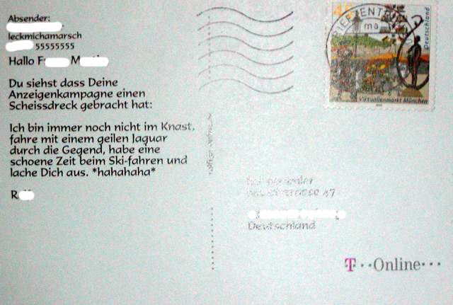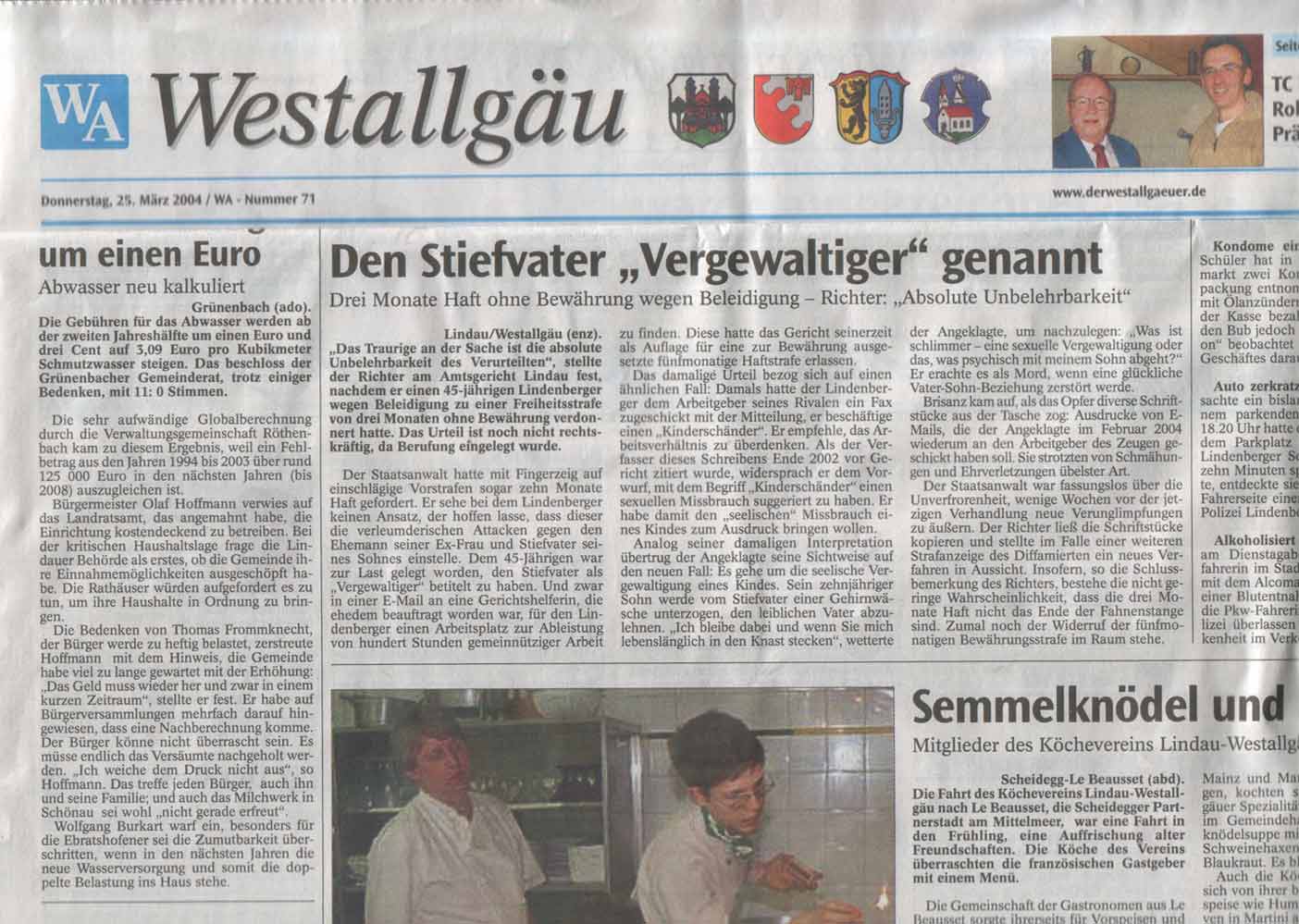 Vater für alles verantwortlich gemacht: Die Ursache des nun fast 8-jaehrigen Konfliktes bleibt weiter unklar, genauso wie Antworten auf die Frage, ob es an den Verhaltensweisen des Vaters liegt - NACHDEM dem Kind eine Woche vor Weihnachten 2001 unvorbereitet und widerrechtlich der Vater entzogen wurde, oder an den Luegen und hysterischen Übertreibungen der Mutter seit sie ihren jetzigen Lebenspartner im Dezember 96 kennen lernt und ob es ueberhaupt stimmt, dass das Kind verunsichert ist und keinen weitern Kontakt zu seinem Vater will, weil die Kindsmutter dem Kind die dringend empfohlene Kinderpsychotherapie nicht zukommen lässt. "Der braucht das nicht." Salut Mathieu 5.4.2005 Warten auf Godot. Immer noch kein neuer Umgangsrechtstermin, der vor über einem Jahr im Februar 2004 (!) hätte stattfinden sollen. Hoffen auf Hippo´s Grillfete am 05.05.2005. Vielleicht kommen von dort endlich neue Impulse. 25.04.2005 Immer noch kein Umgangsrecht-Termin, aber dafür die Fortsetzung der Strafrecht-Berufungsverhandlung in K. mit einer Verurteilung zu 8 Monaten OHNE Bewährung, weil der Kindsvater den Stiefvater im Februar ausgelacht hat - per Postkarte. 07.05.2005 Hippos Grillfete bringt die erhofften Impulse. Merci Hippo, merci www.exentreff.de , merci www.das-familienrecht.de , merci Don Pedro, merci Skar und ein Merci an alle anderen. 20.08.2005 Mario hat Geburtstag und bekommt vom Vater 145 EUR (das Taschengeld der letzten Jahre) geschenkt, die sich die Mutter in die Tasche steckt. 25.08.2005 Das Oberlandesgericht München beschliesst die Revision gegen das Urteil des Langerichts Kempten als unbegruendet zu verwerfen. Damit ist das Urteil rechtskraeftig. 30.09.2005 Der Vater geht wegen Beleidigung für 8 Monate ins "Hotel" und auch Mario´s Halbruder Joschi wird im Alter von 5 Jahren der Vater entrissen. Menschenrechtsbeschwerde in Strassbourg ist eingelegt. Entlassung Anfang Maerz 2006