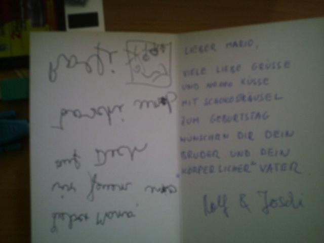 mitbringen." Fr, 20. Juli 01 - Papa, die Mama hat mich wieder gefragt, ob ich denn nun lieber bei Ihnen wohnen will, oder bei Dir und ich hab mich wieder nicht getraut es zu sagen (senkt den Kopf). "Das macht nix, Mario. Du musst nicht die Wahrheit sagen, wenn Du zuviel Angst davor hast." Papa, der Martin hat mich bestraft, weil Du mich auf dem Heimweg von der Schule gesehen hast. Ich durfte zwei Wochen (letztendlich zwei Tage) nicht Fernsehen. Aber das war nicht so schlimm. "Das ist gut, dass Du mir das erzählst hast." Papa, der Martin hat gesagt, Du hättest ihn mit den Fahrradtreteln an der Arsch berührt. "Rolf, ich weiss jetzt was wir mit dem Martin machen: Als erstes schmeissen wir ihn in den Mühlbach und frieren ihn ein. Anschliessend schneidet ihn der Patrick mit der Kettensäge in der Mitte durch und der Mark hackt ihm mit dem Beil den Kopf ab. Anschliessend wird er getrocknet und verbrannt und die Mama direkt mit. Die Asche kommt dann in eine Bleikugel auf den tiefsten Grund des Meeres oder wir schiessen sie auf den Mond." "Mario, würdest Du Dich trauen - jemandem zu sagen, dass Du Dich nicht traust der Mama zu sagen, dass Du gern Tennisspielen würdest ??" Muss ich dann in die Allesannenstrasse zurück ?? "Nein, Du bist doch in der ganzen nächsten Woche bei mir ?" Ja ich meine DANACH, Papa - muss ich dann wieder zu denen zurück ?? "Ja sischer." Nein, dann trau ich mich nicht. 23.07.2001 29.07.01 - "Papa, die haben mich wieder zweimal an der Kopf geschlagen." "Papa, der Martin hat mir den Gameboy abgenommen und in seinen Schrank gesperrt, dass auch die Mama nicht drankommt." Warum? Weiss ich nicht. "Papa, der Martin hat verboten, dass ich die Turnschuhe mit zu Dir nehme. "Da ruf ich jetzt an". Neeeeein, Papa."Doch" neeeeeein "ja, Du brauchst doch die Turnschuhe" nein Papa - bitte nicht "Hast du Angst das er dich bestraft, wenn ich anrufe ?" ja . Der Martin hat gesagt: "Da hat